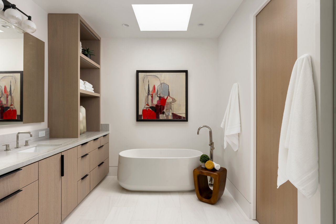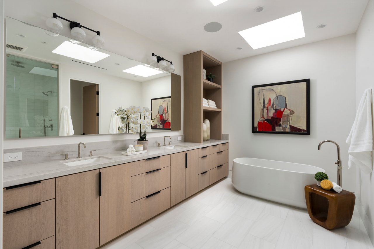 At the heart of the home, the chef's kitchen is anchored by a quartzite island, complemented by a walk-in pantry, abundant storage, and an integrated wine cooler, suited for intimate evenings or refined entertaining. Above, a rooftop terrace offers a quiet escape, where large ocean views provide a breathtaking backdrop for sunsets with the horizon becoming part of daily life. Just moments from the boutiques, cafes, and shoreline of Corona del Mar Village, this residence presents a rare balance of privacy and proximity; a contemporary coastal residence defined by restraint, craftsmanship, and a deep connection to place.