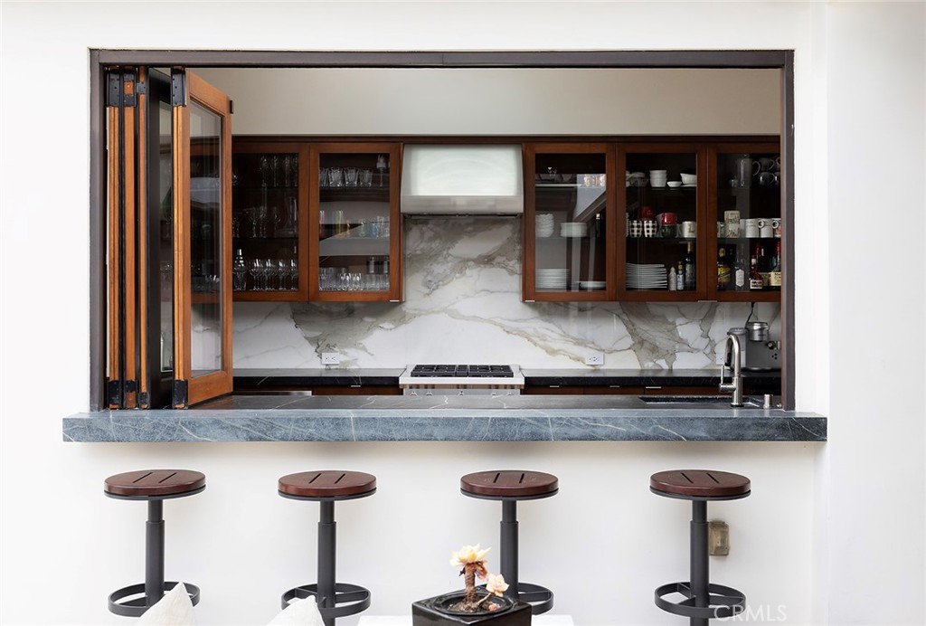 Located in the coveted community of Cameo Shores in Corona del Mar, this extraordinary coastal sanctuary unfolds across an elevated 12,000-square-foot parcel, offering nearly 6,000 square feet of effortless single-level living complemented by an additional 900 square feet of lower-level retreat. The home can delivered fully furnished with curated designer pieces outside of Escrow, a masterclass in understated luxury and seamless indoor-outdoor living. Beyond the private gated entry, a tranquil arrival sets the tone, revealing a sun-washed interior defined by soaring ceilings, walls of glass, and a warm, natural palette of refined textures. South-facing living and dining spaces open gracefully to ocean-view terraces, while the expansive outdoor domain is anchored by a resort-style pool, spa, fire feature, and intimate seating vignettes, inviting quiet moments and meaningful gatherings alike. At the heart of the home, a sculptural culinary kitchen with a striking fifteen-foot island serves as both gathering place and design centerpiece, harmonizing the surrounding living, dining, and outdoor terrace. A discreet secondary kitchen and bar offer effortless service to the central courtyard, while a thoughtfully placed media lounge with bi-fold doors dissolves the boundary between interior and exterior. Interiors are layered with intention: solid wood flooring grounds natural stone surfaces, custom cabinetry and wall coverings add depth, and tailored lighting complements automated shades and drapery. Full Control4 automation orchestrates lighting, climate, audio-visual, security, and window treatments, delivering comfort with quiet precision. The primary suite occupies its own private wing, introduced by an executive office and culminating in a serene bedroom with fireplace, sitting area, and direct access to the pool and spa. A spa-inspired bath features dual vanities, bespoke cabinetry, stone-and-glass shower, and soaking tub, while an expansive dressing room with center island and enclosed wardrobes completes the retreat. Four additional bedroom suites and two powder rooms provide gracious accommodations, while the lower level reveals a four-car garage, wine cellar, full bath, and state-of-the-art cinema with entertaining bar. Crowning the residence, a rare rooftop deck offers sweeping panoramic ocean vistas, a peaceful perch above it all. Residents of Cameo Shores enjoy gated access to three private beaches and Crystal Cove State Beach.
